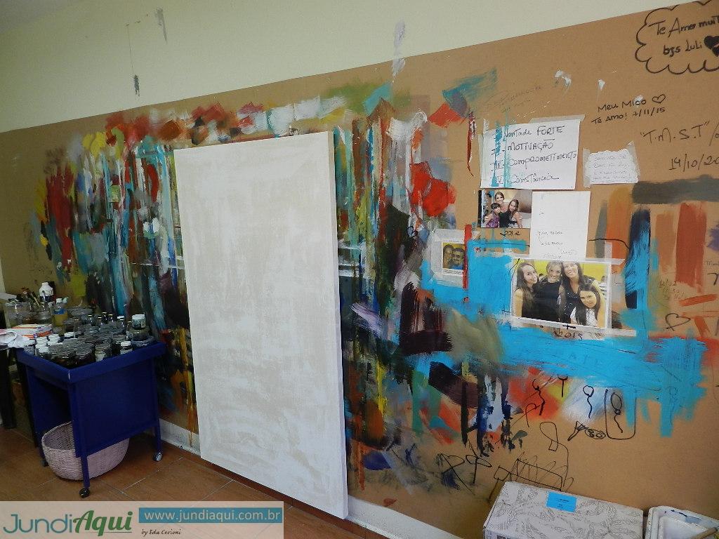 Chris conta que sempre foi inquieta. E isso se vê em todos os cômodos da casa, com muitas telas das diferentes fases, outras tantas ainda em branco à espera de que solte a criatividade, sem contar os cavaletes, as mesas, uma infinidade de tubos e vidros de tinta e massas, algumas até em galões de lata, os pincéis, as espátulas… Os pincéis ela limpa nas paredes, revestidas de duratex – Val Junior se encantou com o resultado dessa brincadeira.