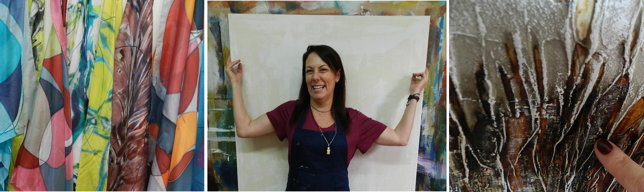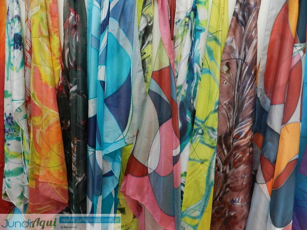 Cada lenço se torna uma tela e ganha sentimento – fez pedagogia terapêutica, com o que vê o ser humano com mais profundidade, sente toda a emoção e consegue como poucos na cidade passar isso ao seu trabalho visual.