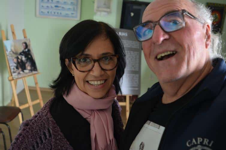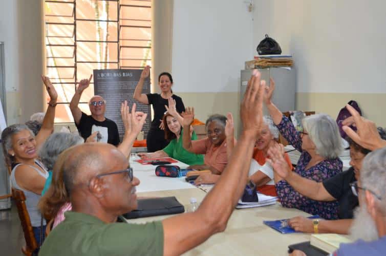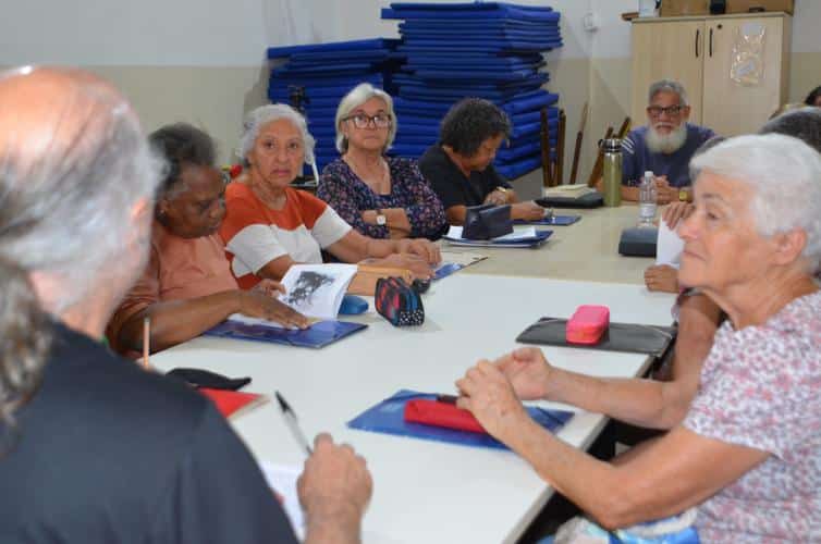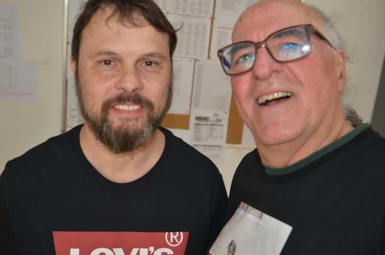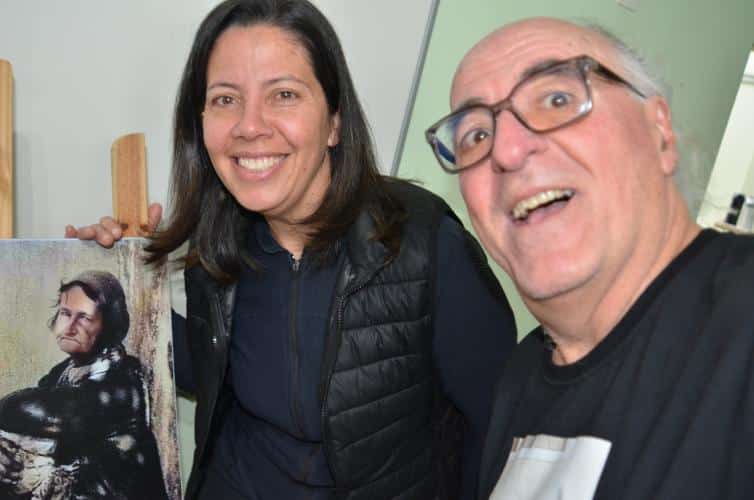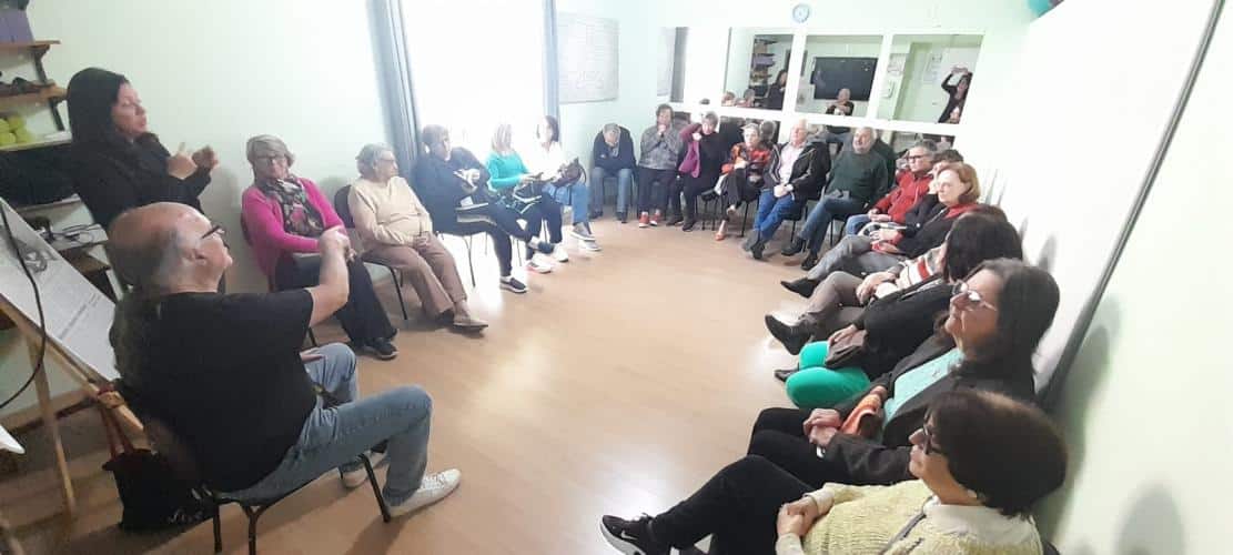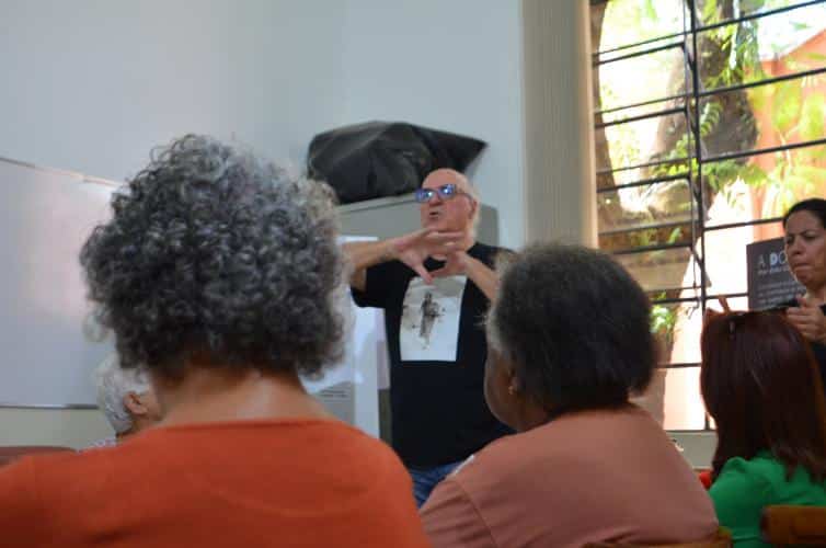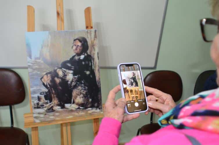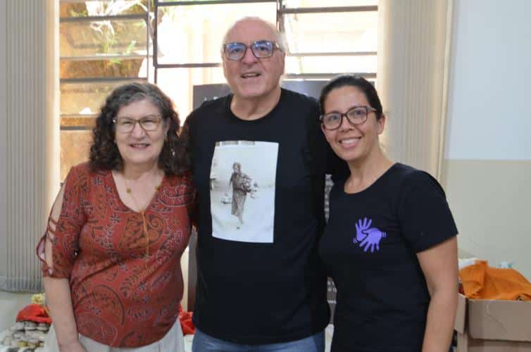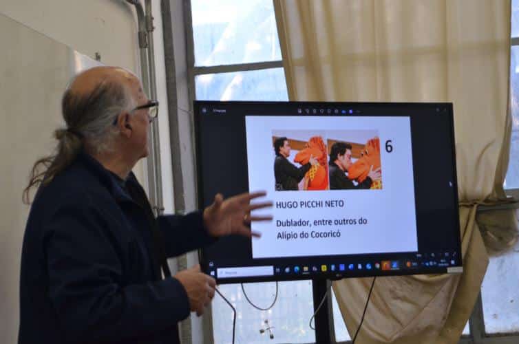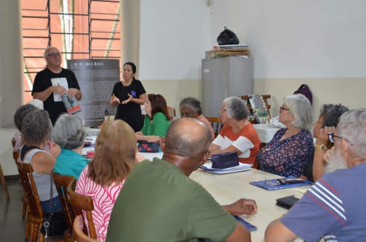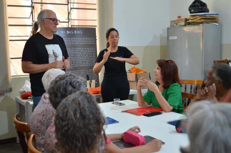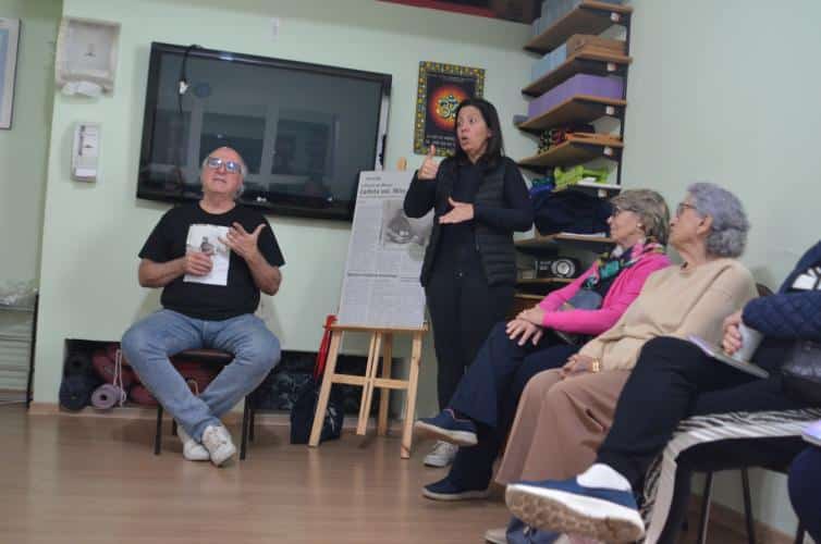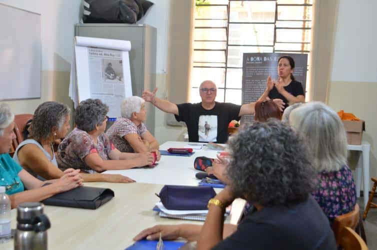 A primeira conversa foi no Criju, dentro do Complexo Argos. Todos na faixa dos 60 anos ou mais. O papo fluiu gostoso com os alunos da professora Marli Marchini Cabreira. Foi no portão da Argos que Edu Cerioni fotografou Maria dos Pacotes em 1986, imagem que ilustra a camiseta que ele usou nas ações incentivadas pela Lei Paulo Gustavo.