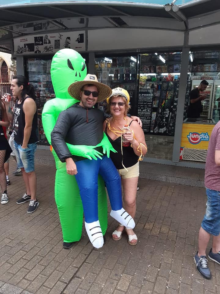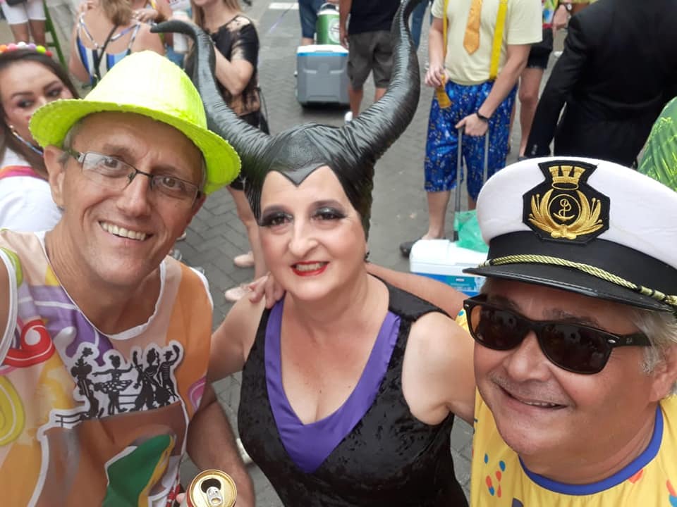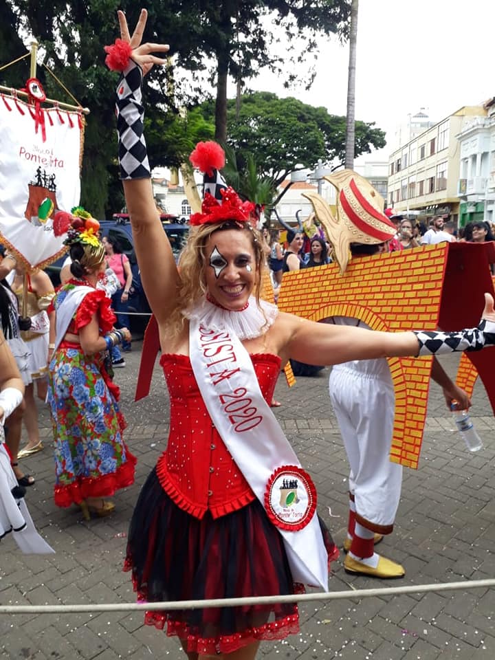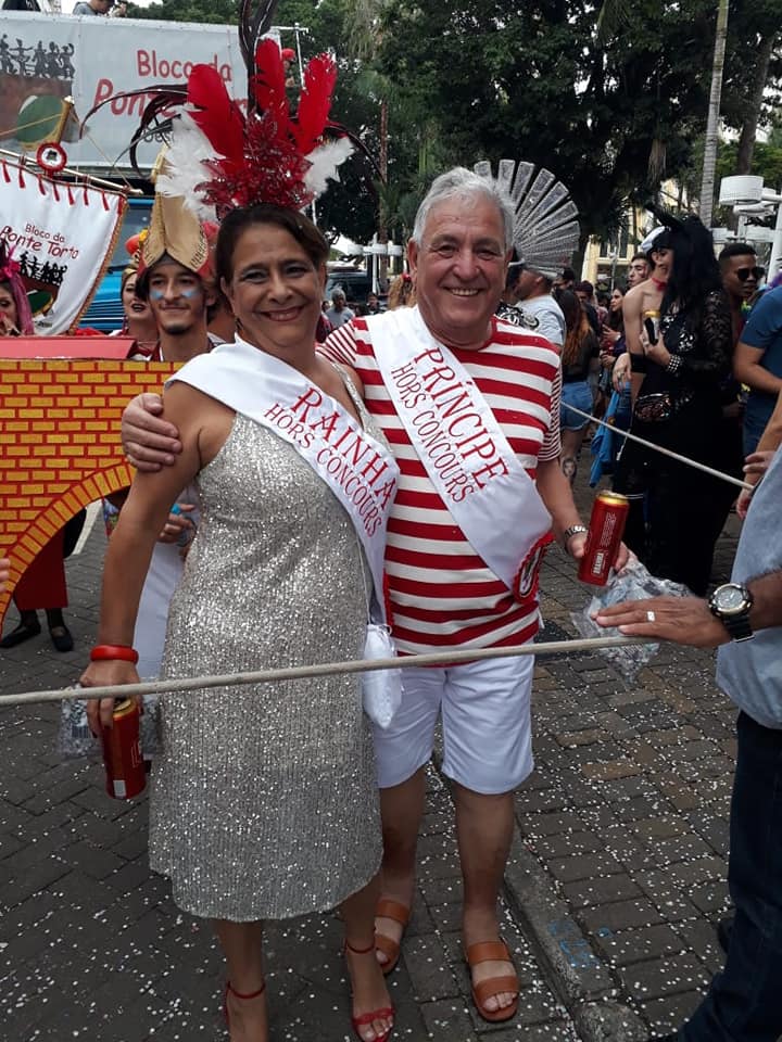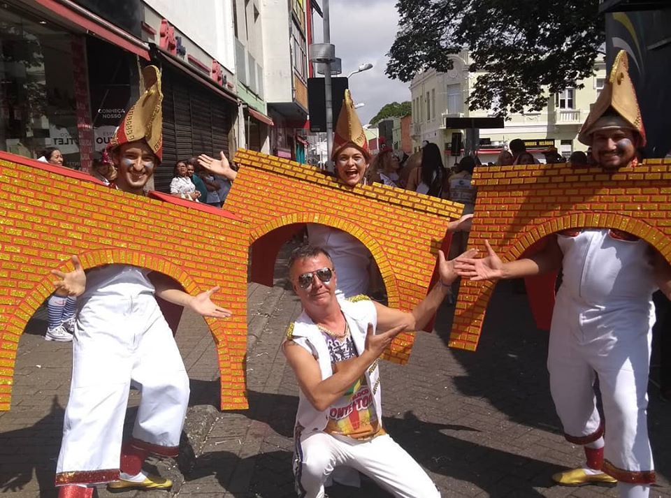 O desfile do bloco da Ponte Torta neste 22 de fevereiro contou com uma comissão de frente em que três atores, Marcela Derpich, Luan Silva e Matheus Ferreira, se vestiram do monumento Ponte Torta.