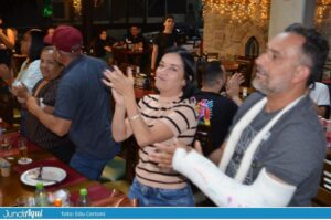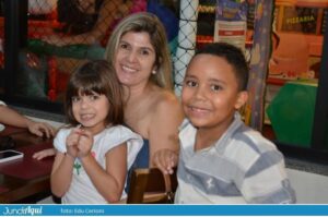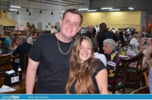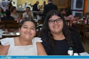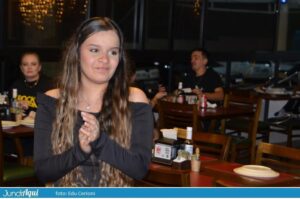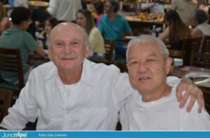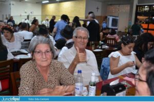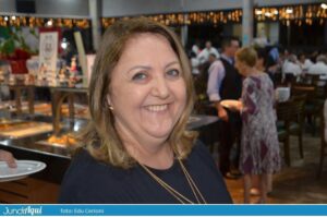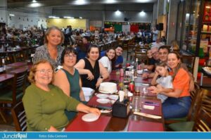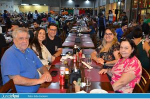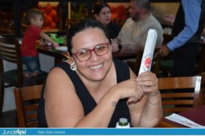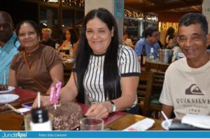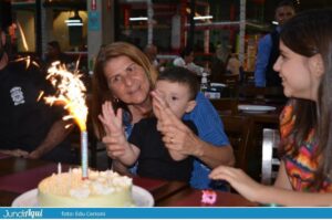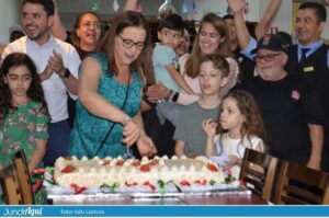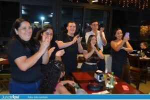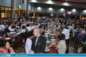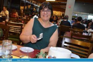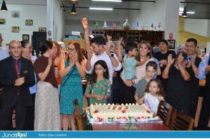 Foi um festão com direito a bolo gigante e também comemoração de muitos outros aniversários de clientes. A todo momento se ouviam palmas e o tradicional “parabéns a você” por todo o grande salão.