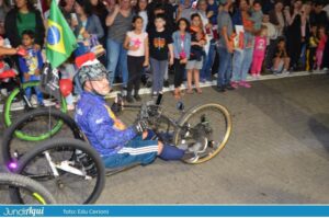 Cada vez que o artista de circo Uli Vertuan subia em sua bicicleta com a roda dianteira imensa e a traseira bem pequenininha, vinha um frio na barriga do público. Sem sustos, todos curtiram muito. Teve mais bicicleteiros no desfile ainda.