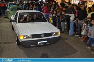 Também desfilaram a rainha e as princesas da Festa da Uva 2026, Suelen de Faria, Bárbara Zomignani e Maria Fernanda Schincariol. Começa dia 15 de janeiro, cheia de novidades.