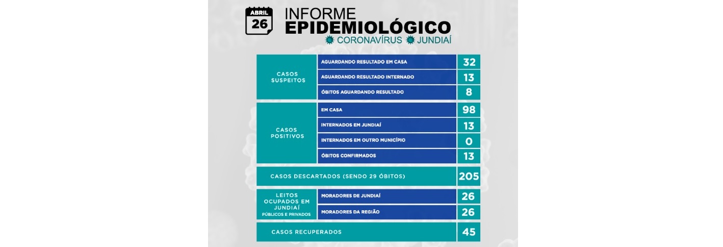 O homem, de 43 anos, estava internado no Hospital São Vicente de Paulo desde o dia 16 de abril e morreu neste domingo (26). A mulher, de 72 anos, teve o óbito registrado no dia 4, ainda como caso suspeito e também ficou internada no HSVP, com exame de teste saindo só agora. Os dois tinham doença cardiovascular e eram obesos, segundo informe da Prefeitura de Jundiaí.