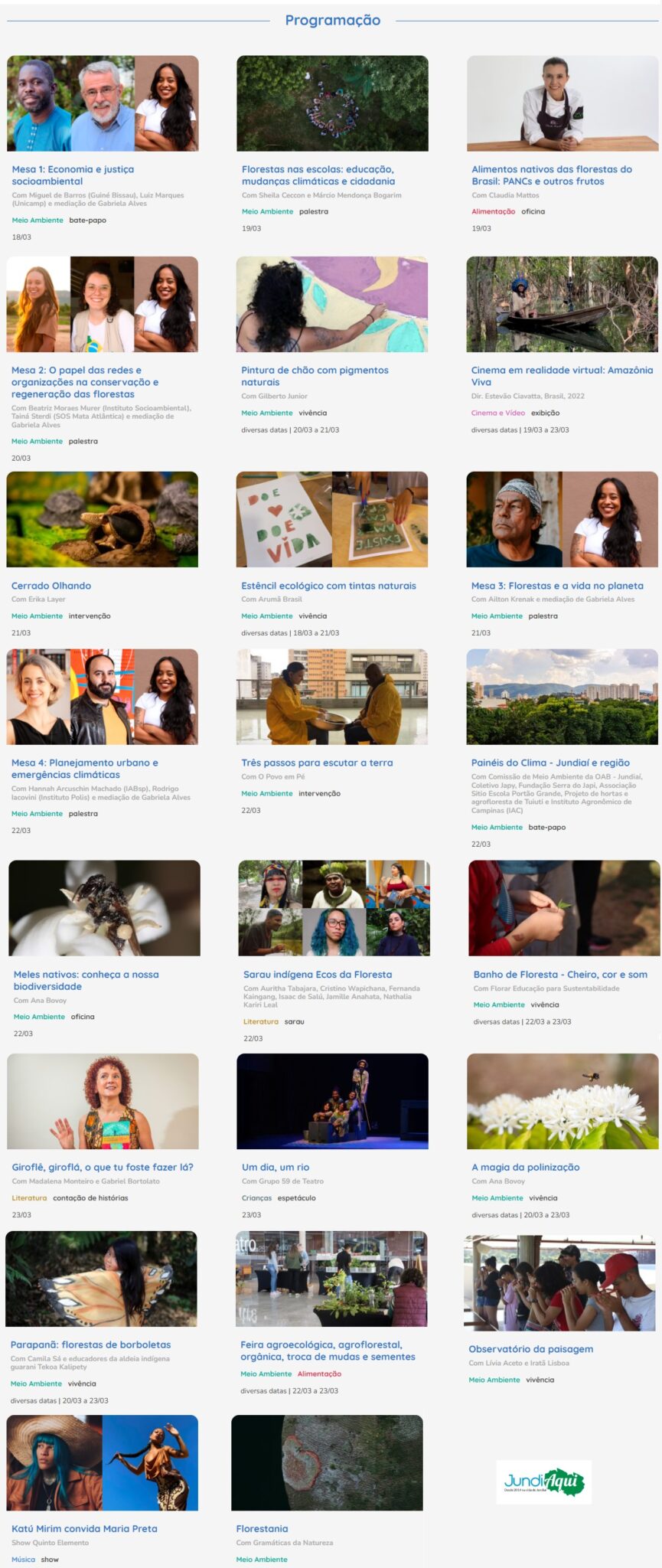 De 18 a 23 de março, o Sesc Jundiaí oferece o projeto “Ecos da Floresta: a vida em tempos de emergências climáticas”, uma reflexão sobre a relação entre sociedade e meio ambiente, abordando a importância das florestas para a regulação do clima e a manutenção da vida no planeta. Vai ter rodas de conversa, espetáculos de teatro e dança, além de oficinas.