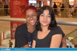 Sarah e Maria Eduarda escolheram o Maxi para festejar um mês juntas. Levaram uma câmera fotográfica Instax, produzida pela Fujifilm – um modelo concorrente da Polaroid – para registrar em fotos reveladas instantaneamente esse momento especial. Gostam dali porque “é bem tranquilo, cada um na sua”.