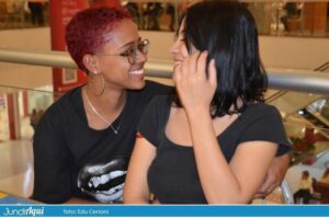 Sarah e Maria Eduarda escolheram o Maxi para festejar um mês juntas. Levaram uma câmera fotográfica Instax, produzida pela Fujifilm – um modelo concorrente da Polaroid – para registrar em fotos reveladas instantaneamente esse momento especial. Gostam dali porque “é bem tranquilo, cada um na sua”.