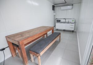 Com cerca de 30 m², o container ampla porta balcão envidraçada oferece sanitários, copa e cozinha com mesa e bancos, pia, filtro de água e microondas, além de ambiente para descanso e com pontos de energia para recarga de celulares. Tem ar-condicionado. Tudo vigiado por câmeras de segurança.