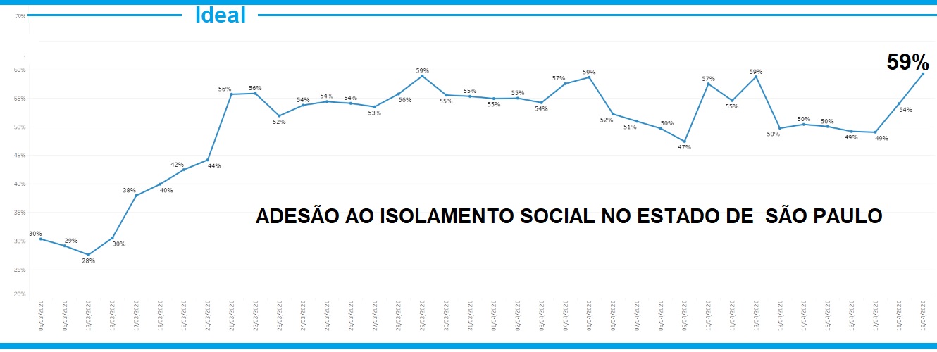 O Governo de São Paulo mostra que o percentual de isolamento social no Estado foi de 59% neste domingo (19). A central de inteligência analisa os dados de telefonia móvel para indicar tendências de deslocamento e apontar a eficácia das medidas de isolamento social. Com isso, é possível apontar em quais regiões a adesão à quarentena é maior e em quais as campanhas de conscientização precisam ser intensificadas, inclusive com apoio das prefeituras.