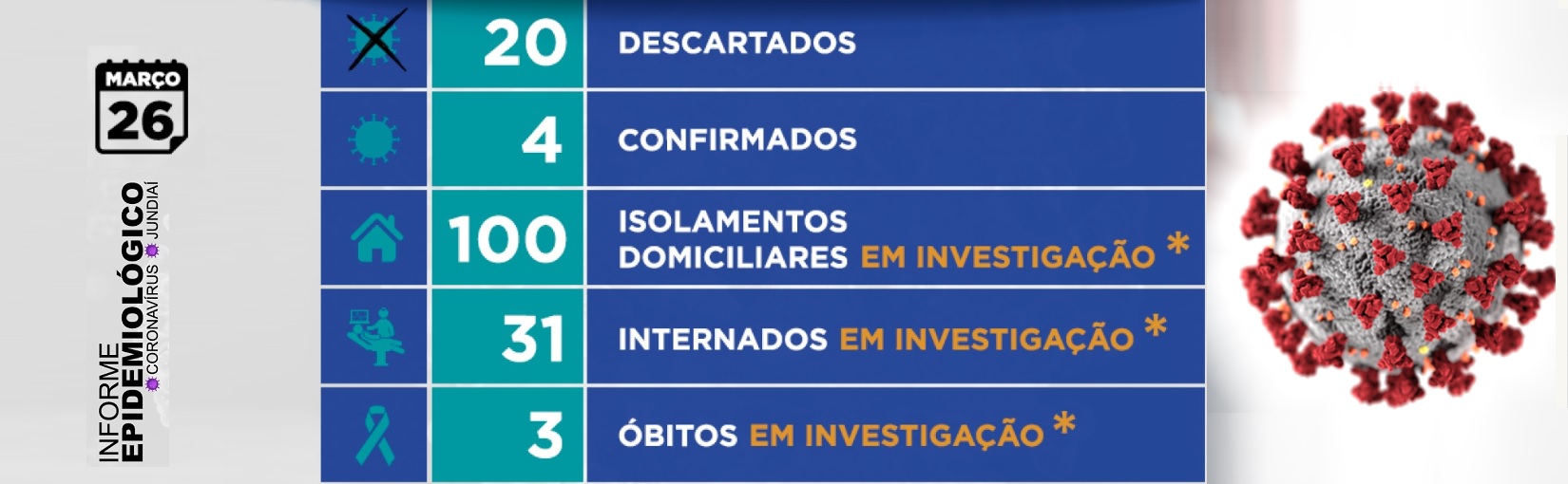 Junto com esse caso confirmado, o Adolfo Lutz mandou também para cá quatro que deram negativo. Assim, a cidade contabiliza, no total, 158 notificações, 20 negativados (descartados) e quatro positivos (confirmados), 100 em isolamento domiciliar (em investigação), 31 internados em investigação e três óbitos em investigação. Os internados estão divididos entre os hospitais públicos e privados daqui e apresentam quadro de Síndrome Respiratória Aguda Grave.