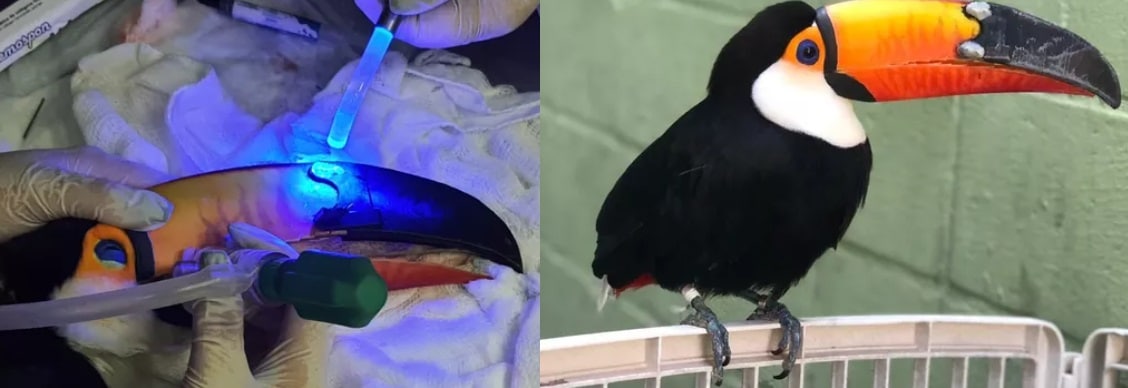 Anna Beatriz Nicolau Rocha reuniu uma equipe de 15 pessoas que estudou em tempo recorde a aplicação da tecnologia feita com resina fotopolimerizadora e o pino intramedular que, segundo a veterinária, oferece ao tucano a mesma qualidade de vida anterior ao incidente – o peso total não passou de 30 gramas. Ajudaram um engenheiro, designer, dentista e ortopedista.