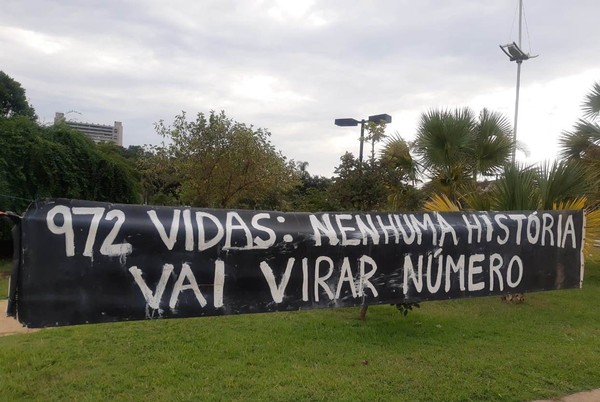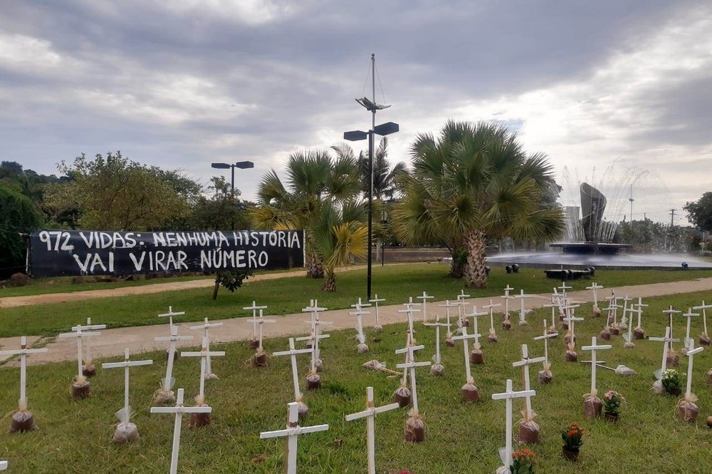 Uma faixa preta com letras brancas foi fixada atrás das cruzes com os dizeres “972 vidas: nenhuma história vai virar número”.