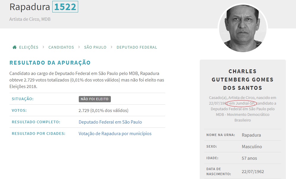 Rapadura também foi candidato a deputado federal em 2018, pelo MDB, mas conseguiu somente 2.729 votos, sendo 179 deles aqui em Jundiaí, cidade pela qual se candidatou.