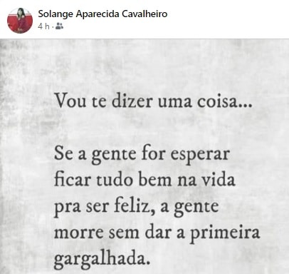 A vida é um sopro realmente e prova é que quatro horas antes de sofrer um infarto fulminante na tarde desta segunda-feira (28), a aposentada da Prefeitura de Jundiaí, que trabalhou na Setransp, postou um recado no Facebook aos pessimistas. “Vou te dizer uma coisa.. se a gente for esperar ficar tudo bem na vida pra ser feliz, a gente morre sem dar a primeira gargalhada”.
